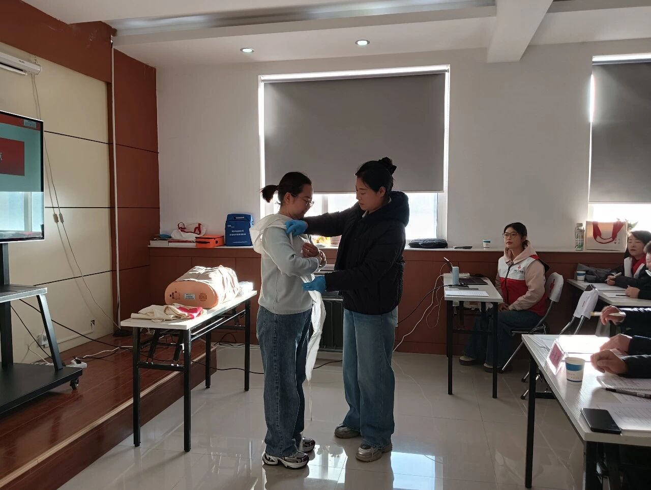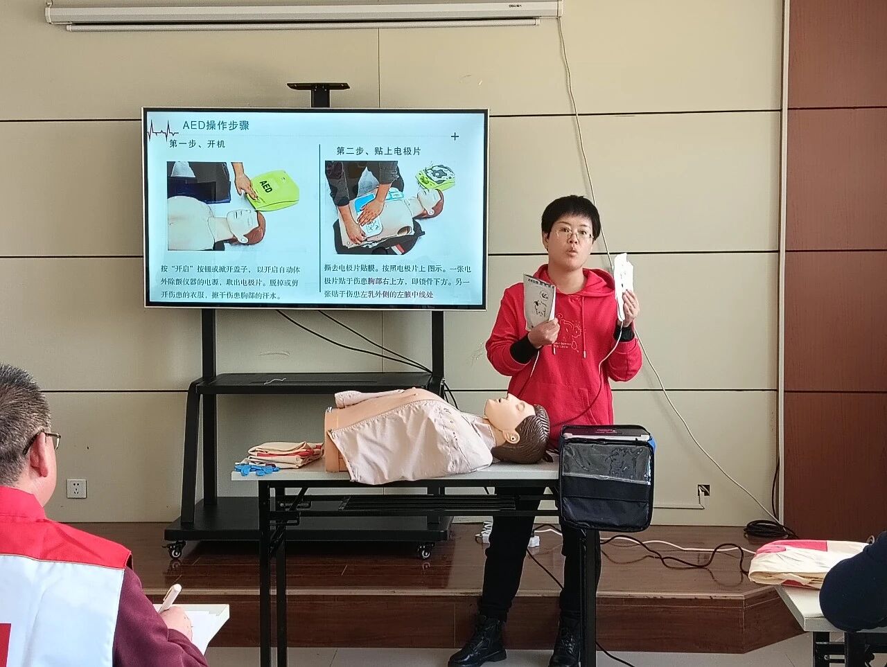 讲评会现场气氛热烈,每位师资们在10分钟内通过ppt演示与现场实操相结合,围绕心肺复苏、AED使用及骨折固定等核心内容,进行课程片段展示,过程准备充分,讲解清晰,展现了师资扎实的理论基础和良好的教学潜质。