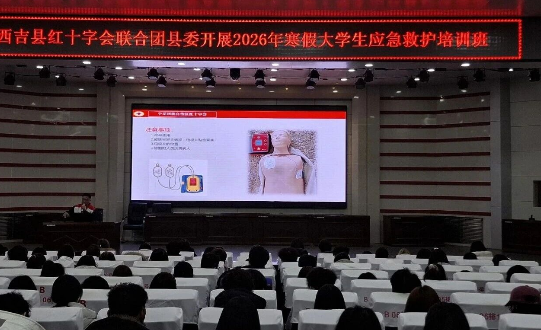 为提升大学生自救互救意识和能力,切实保障人民群众的生命安全和身体健康。2026年1月13日,西吉县红十字会联合团西吉县委在西吉中学报告厅开展寒假大学生应急救护知识培训班,约100余人参加本次培训。