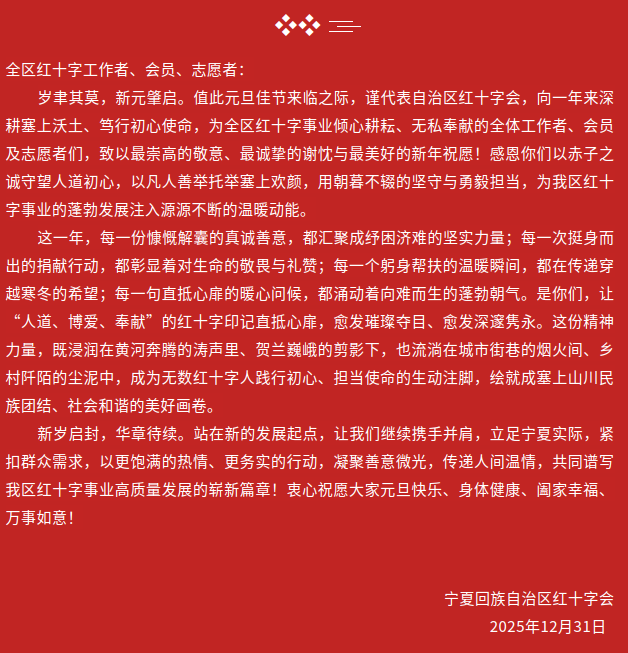 2026-01-14 09:47:00    来源:宁夏红十字会   作者:    【打印本页】    字体: [][ ][ ]